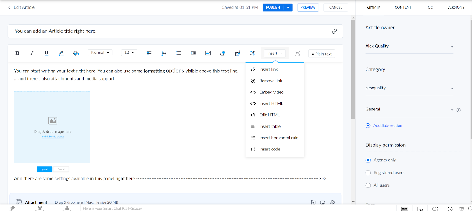 Teadmusbaasi artiklite redaktor on lihtsalt suurepärane. Kohe on näha kõik olulised kirjutamis- ja vormindusfunktsioonid, samuti tekstiväljad ja manuste valikud. Zoho Deski teadmusbaasi tekstiredaktori üle ei saa kurta. Olemas on ka mõned lisaseaded SEO, lubade, artiklite aegumise, kategooriate ja muu jaoks.