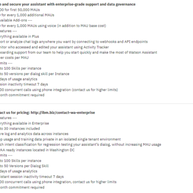 Veelgi enamatele funktsioonidele juurdepääsu saamiseks võite tellida IBMi suurettevõtte plaani, mis on kohandatud hinnaga. Lisaks sellele, mis on juba kahes eelmises plaanis sisaldunud, annab Enterprise plaan teile juurdepääsu andmete eraldamisele, sisseelamise toele, partii kavatsuste klassifitseerimisele, HIPAA-le, tööaja SLA-le, segmentide integreerimisele ja muule.