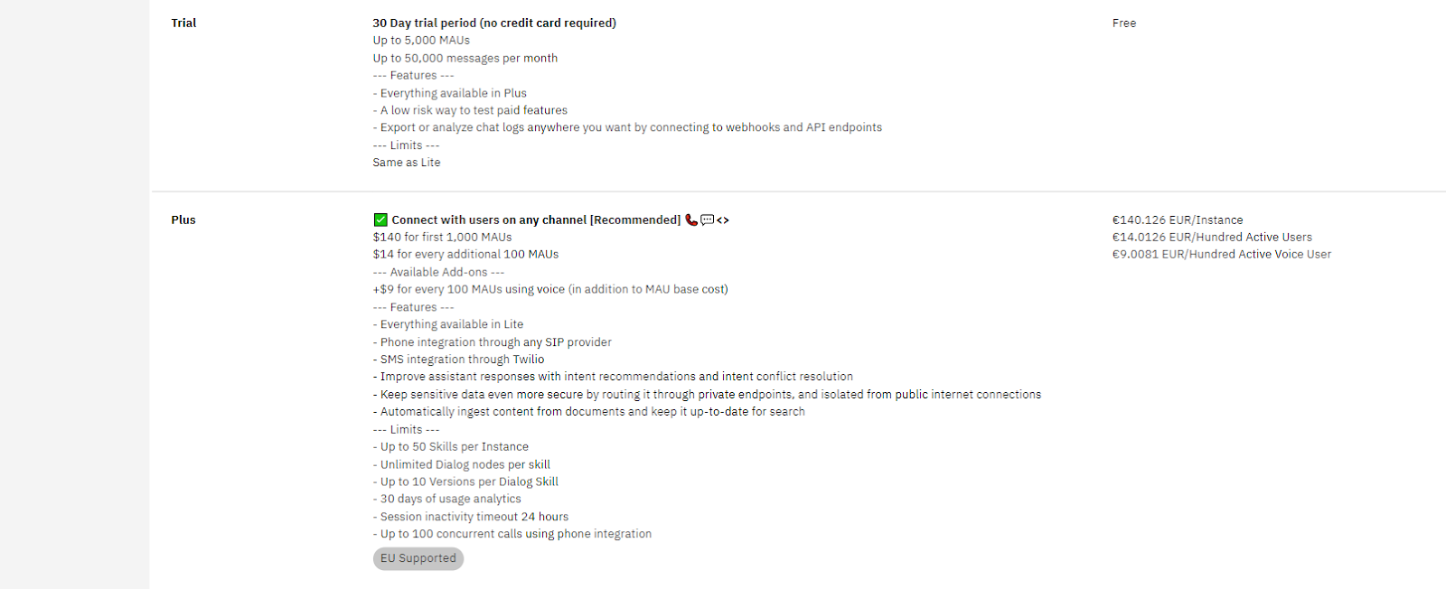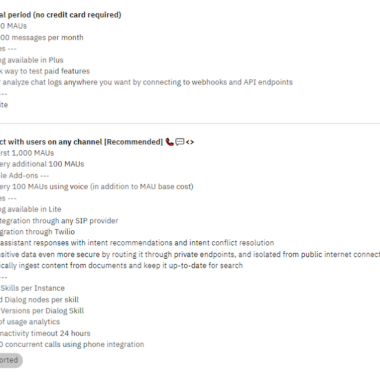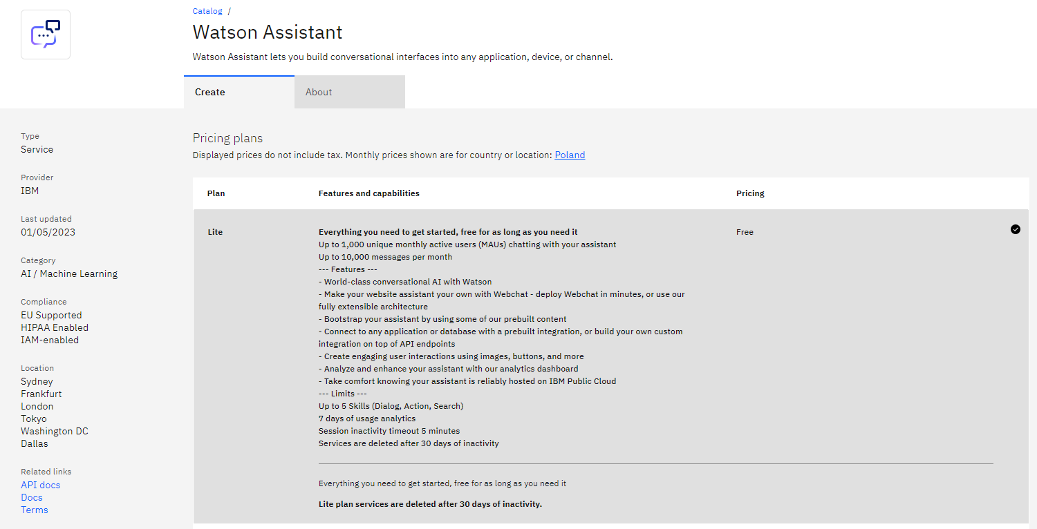 Esiteks on IBM Watson Assistantil täiesti tasuta kasutatav versioon. Lisaks saavad kasutajad tellida tasulisi plaane. Allpool on kõik saadaolevad plaanid ja nende üksikasjad.