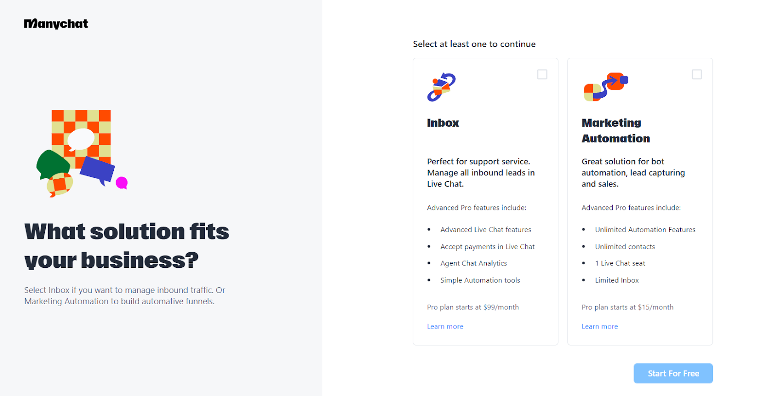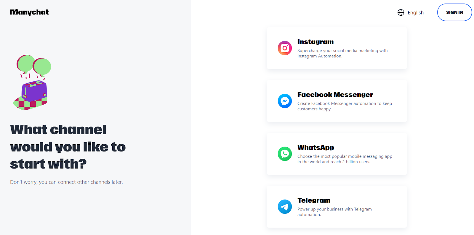 Minu jaoks algas Manychati installimise protsess Manychati veebilehe külastamisega, pidin klõpsama “Alusta tasuta” nupul. Sealt paluti mul valida üks neljast kanalist: Instagram, Facebook, Telegram ja WhatsApp. Kuna soovisin vestlusrobotit Facebook Messengeris testida, klõpsasin sellel valikul ja logisin oma Facebooki kontoga sisse.