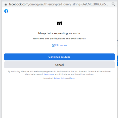 Manychat taotles juurdepääsu paljudele erinevatele üksikasjadele minu ja mulle kuuluvate lehtede kohta, nagu nimi, profiilipilt, e-posti aadress, lehtede haldamine ja juurdepääs ning palju muud. Mul ei jäänud muud üle, kui nõustuda ning seejärel sain edasi minna.