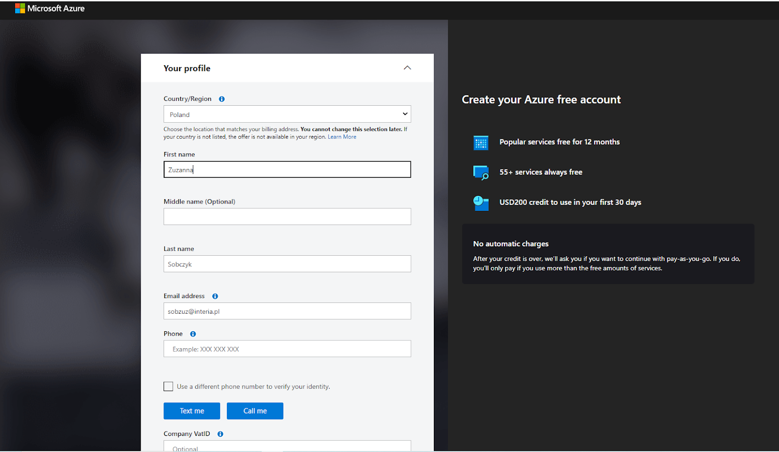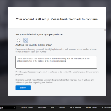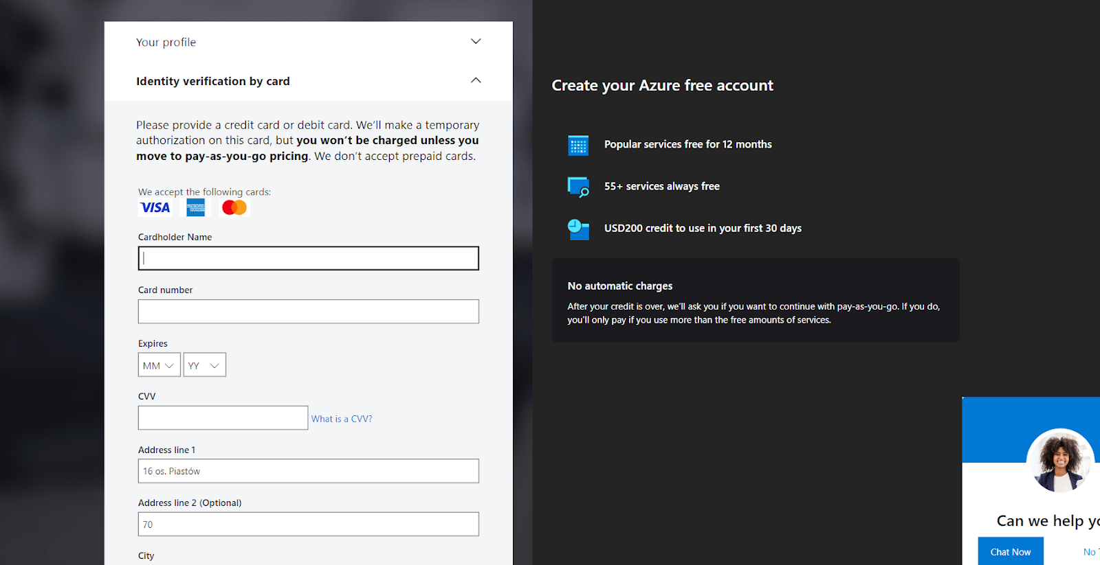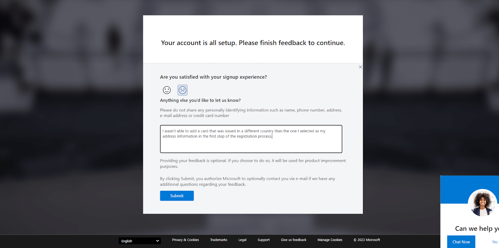 Registreerumisprotsessiga edasi liikudes paluti mul esitada oma krediitkaardi andmed. Mulle väga ei meeldi see lähenemine (eriti kui tegemist on tasuta tööriistaga, mida proovin katsetada ja arvustada). Kuid ilma liigse mõtlemiseta andsin Microsoftile oma arveldusandmed. Selles etapis puutusin kokku ühe probleemiga – ma ei saanud kasutada kaarti, mis ei olnud registreeritud samas riigis, mis ma eelmises etapis oma aadressiks määrasin. See oli veidi ärritav ja muutis protsessi töömahukamaks.